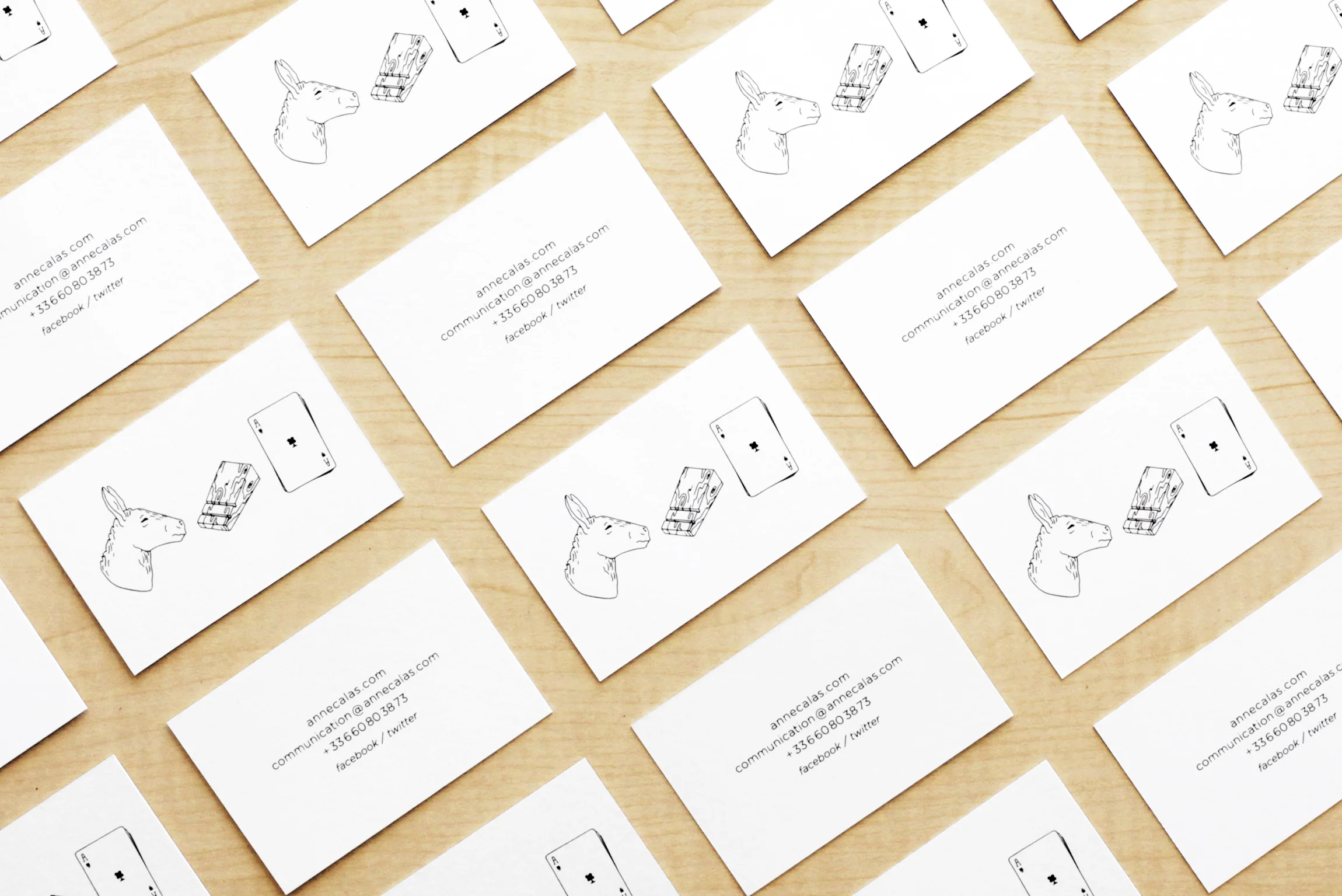 Anne Calas (author, poet, singer) wanted a business card playful, clever and minimalist. After plurality of funny ideas, Anne Calas has choosen the "rebus" card, the most unexpected and daring proposal.